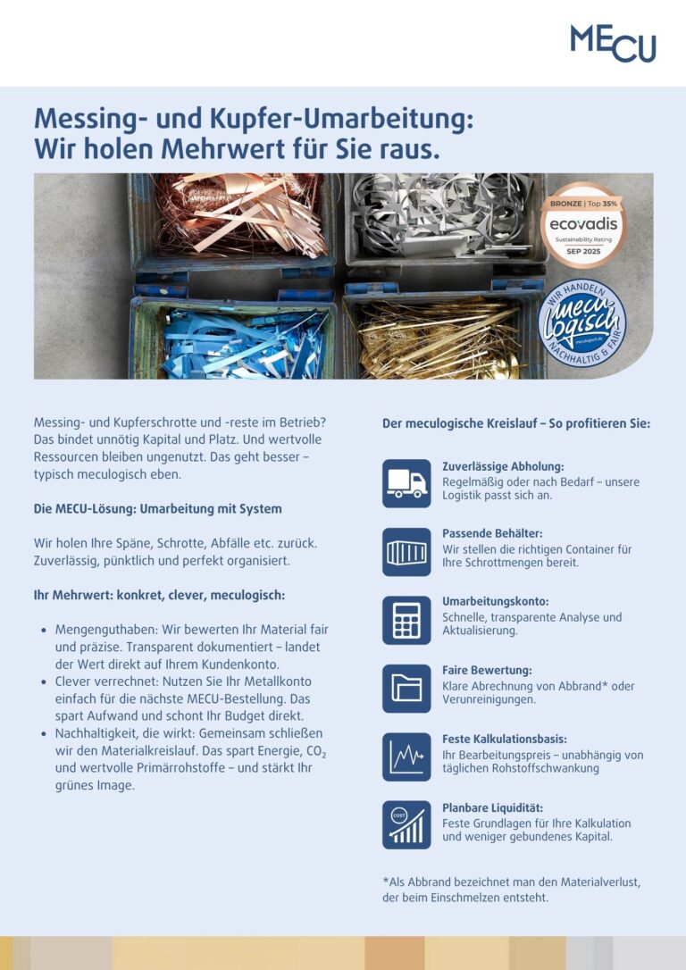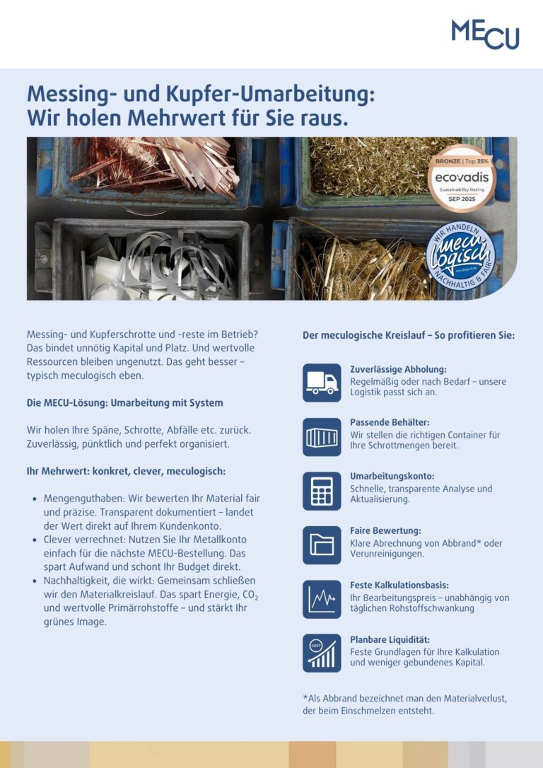 Nutzen Sie Ihr neu gewonnenes Metallkonto ganz einfach für Ihre nächste Bestellung bei MECU. Das reduziert Ihren administrativen Aufwand und entlastet Ihr Budget sofort und ohne Umwege. - Gelebte Nachhaltigkeit, die sich auszahlt